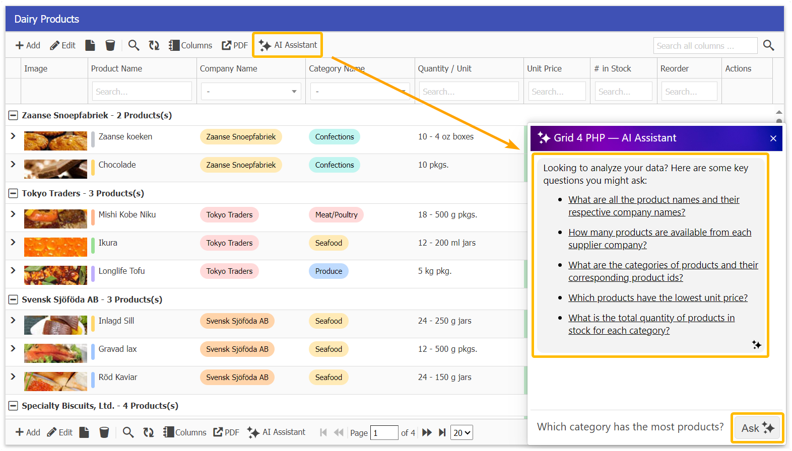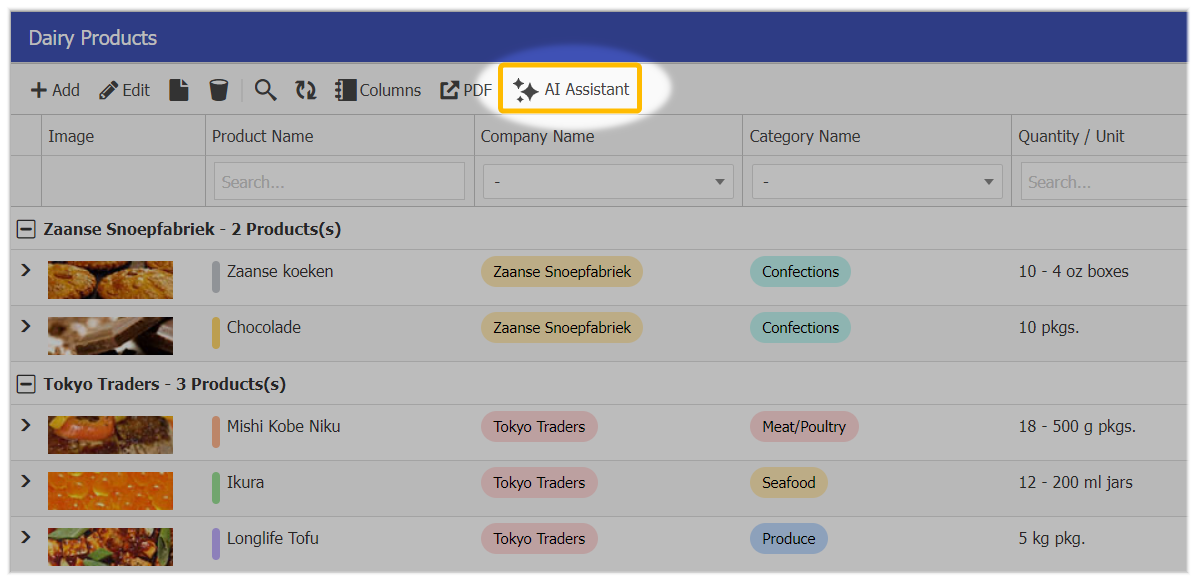 When you click the AI Assistant button, It will open a chat mode for the DataGrid where you can ask the questions about your data.