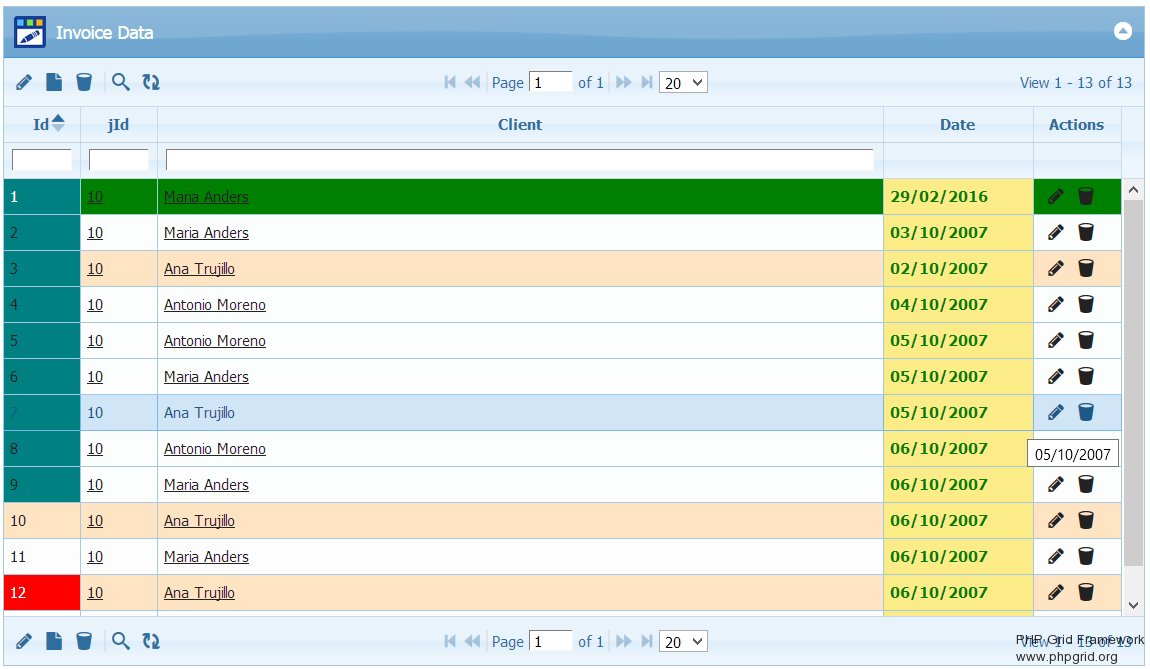 With conditional formatting, you can specify the CSS of rows or columns based on data in it. When specifying class name you must declare the css class in your document before usage. (refer example: conditional-format.php)