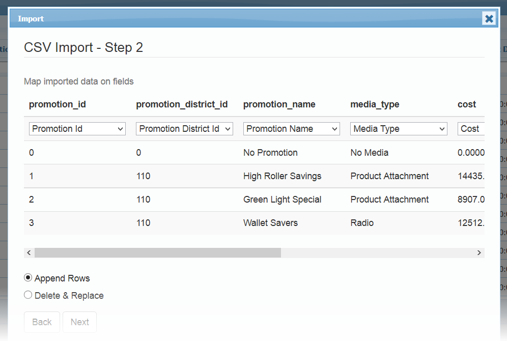 By default new rows are appended. If you want to show append or replace option on Step2, you can set: